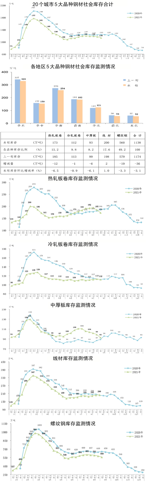 9月上旬,20個城市5大品種鋼材社會庫存1138萬噸,環比減少36萬噸,下降3.1%,庫存連續下降;比年初增加408萬噸,上升 55.9%;同比減少105萬噸,下降8.4%。