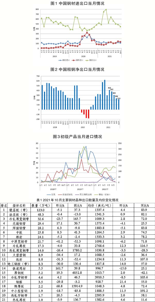 初級產品進口量多數環比回落。10月份,我國直接還原鐵、鋼坯、再生鋼鐵原料進口量分別為2.0萬噸、136.0萬噸和1.2萬噸,環比分別回落7.5%、6.7%和51.8%;當月僅生鐵進口量環比增長48.4%至7.9萬噸。1月~10月份,我國鋼坯、生鐵、直接還原鐵、再生鋼鐵原料進口量分別為1072.5萬噸、160.0萬噸、150.0萬噸和50.2萬噸,除再生鋼鐵原料外,其他初級產品因海外需求強勁恢復、國際價格大幅上漲等原因,進口量同比下降,但均較2019年有明顯增長。