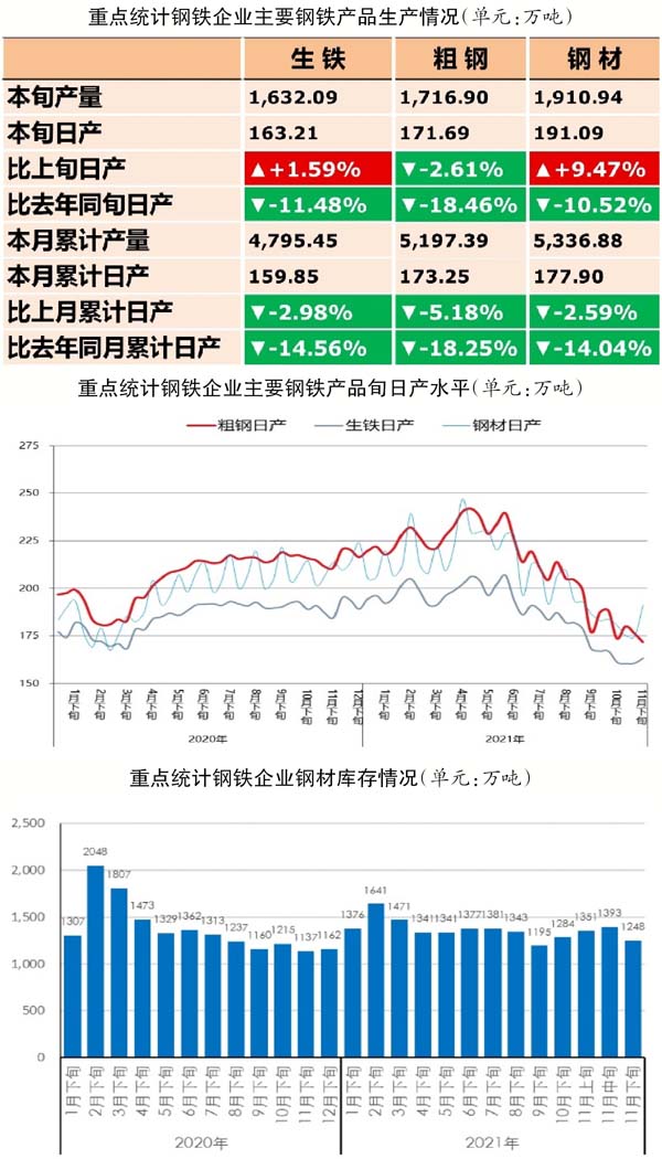 11月下旬,重點統(tǒng)計鋼鐵企業(yè)共生產(chǎn)粗鋼1716.90萬噸、生鐵1632.09萬噸、鋼材1910.94萬噸。其中,粗鋼日產(chǎn)171.69萬噸,環(huán)比下降2.61%;生鐵日產(chǎn)163.21萬噸,環(huán)比增長1.59%;鋼材日產(chǎn)191.09萬噸,環(huán)比增長9.47%。