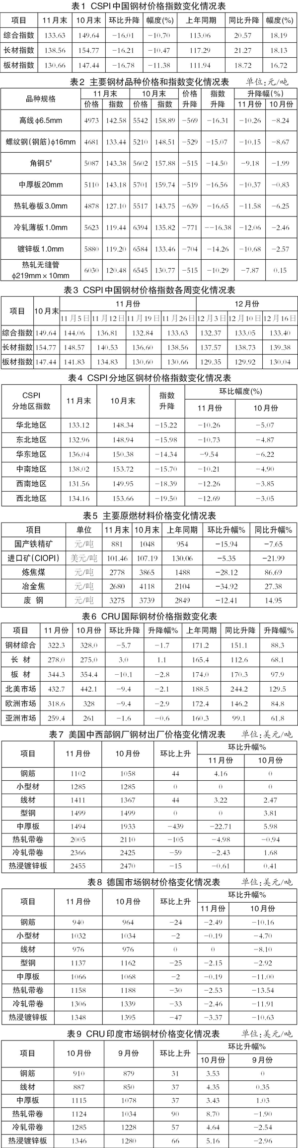 11月份,粗鋼產(chǎn)量總體平穩(wěn),但主要用鋼行業(yè)仍需求不振,煤炭、焦炭價格明顯回落,疊加部分地區(qū)疫情反復(fù)和極端天氣等因素,鋼材價格環(huán)比降幅加大。