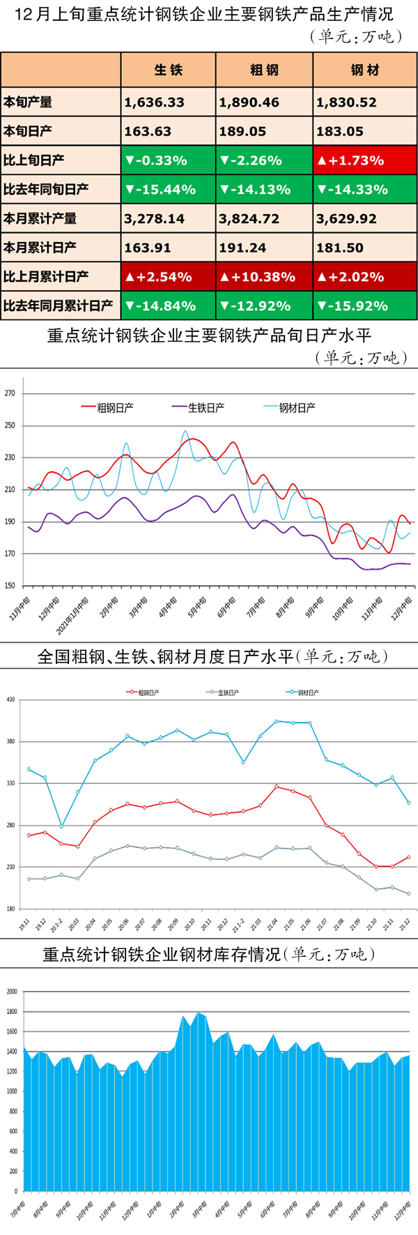 2021年12月中旬,重點統(tǒng)計鋼鐵企業(yè)共生產(chǎn)粗鋼1890.46萬噸、生鐵1636.33萬噸、鋼材1830.52萬噸。其中,粗鋼日產(chǎn)189.05萬噸,環(huán)比下降2.26%;生鐵日產(chǎn)163.63萬噸,環(huán)比下降0.33%;鋼材日產(chǎn)183.05萬噸,環(huán)比上升1.73%。