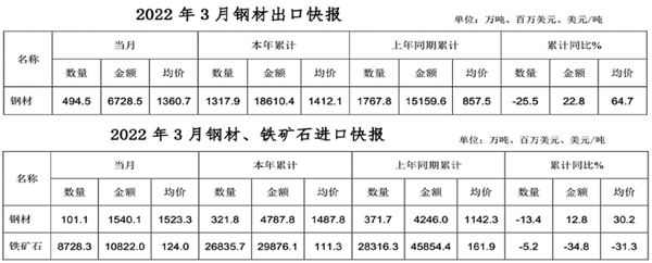 3月份,我國出口鋼材494.5萬噸,同比減少259.7萬噸,下降34.4%;均價為1360.7美元/噸,同比上升522.7美元/噸,增長62.4%。1月~3月份,我國累計出口鋼材1317.9萬噸,同比減少449.9萬噸,下降25.5%。