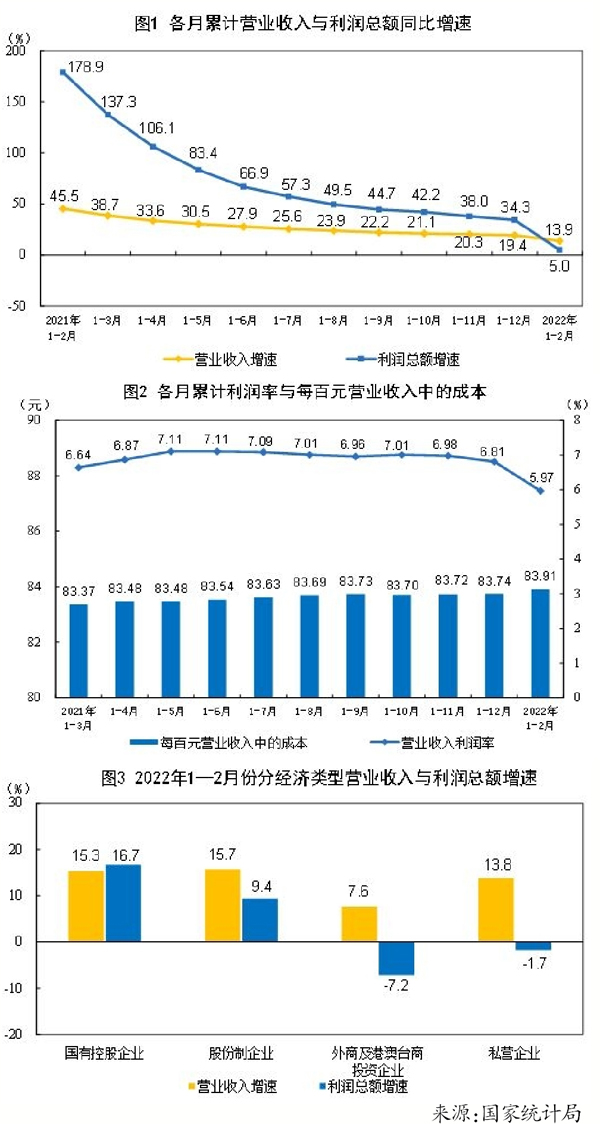 1月~2月份,規模以上工業企業實現營業收入19.40萬億元,同比增長13.9%;發生營業成本16.28萬億元,增長15.0%;營業收入利潤率為5.97%,同比下降0.50個百分點。