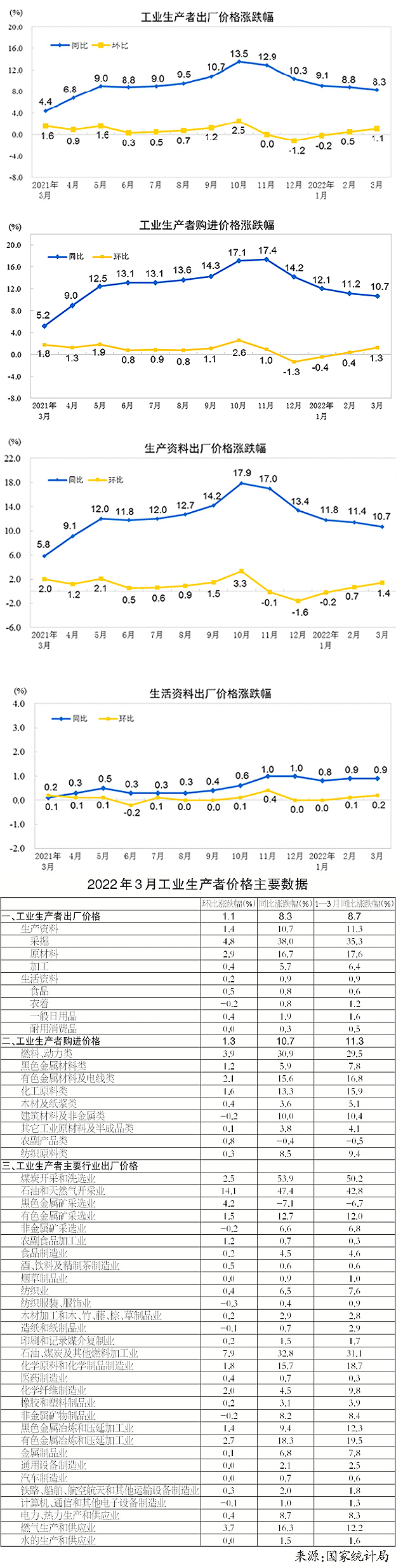 國家統(tǒng)計局發(fā)布數(shù)據(jù)顯示,3月份,全國工業(yè)生產(chǎn)者出廠價格同比上漲8.3%,環(huán)比上漲1.1%;工業(yè)生產(chǎn)者購進(jìn)價格同比上漲10.7%,環(huán)比上漲1.3%。第一季度,工業(yè)生產(chǎn)者出廠價格同比上漲8.7%,工業(yè)生產(chǎn)者購進(jìn)價格上漲11.3%。