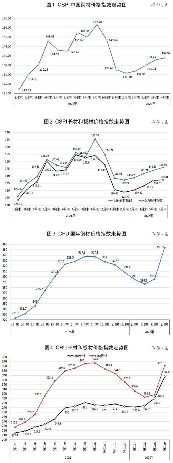 4月末,CSPI長材指數為145.98點,環比上升2.15點,升幅為1.49%;CSPI板材指數為137.34點,環比上升0.32點,升幅為0.23%。長材、板材指數同比分別下降5.41點和12.97點,降幅分別為3.57%和8.63%。(見圖2、表1)