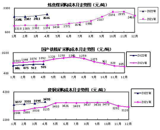 4月份,煤焦和鐵礦石、廢鋼采購成本繼續(xù)上升。