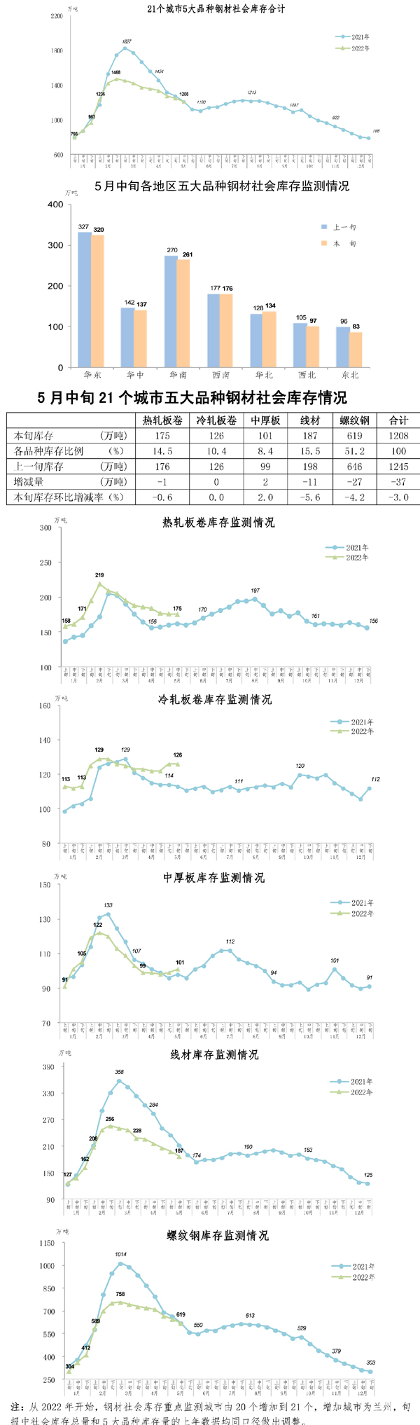 5月中旬,21個(gè)城市五大品種鋼材社會(huì)庫存為1208萬噸,環(huán)比減少37萬噸,下降3.0%,庫存繼續(xù)小幅下降;比今年初增加420萬噸,上升53.3%;同比增加2萬噸,上升0.2%。