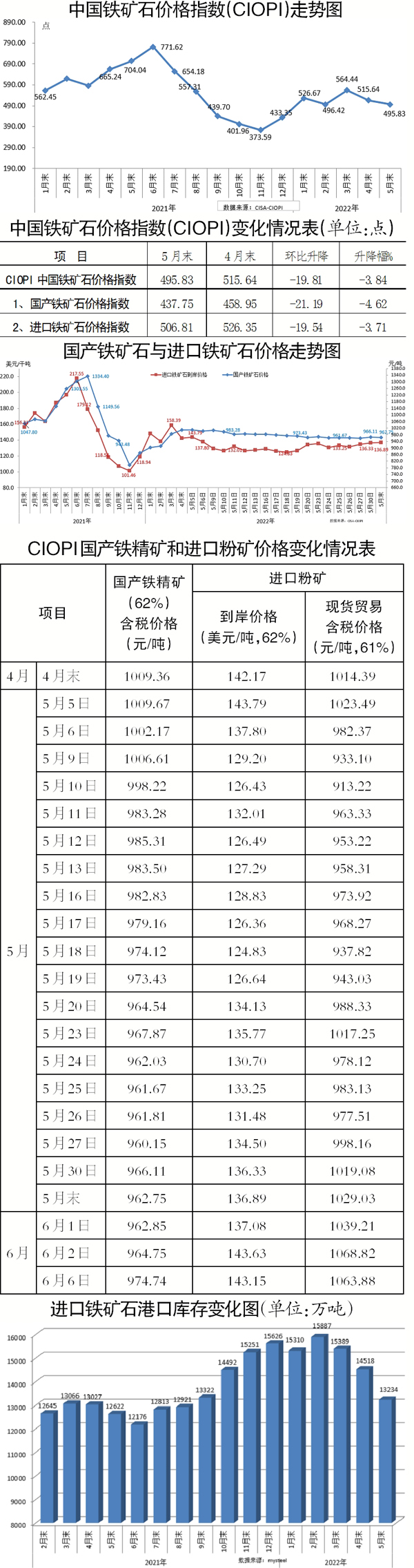 據中國鋼鐵工業協會監測,5月末,中國鐵礦石價格指數(CIOPI)為495.83點,環比下降19.81點,降幅為3.84%;降幅較4月份收窄4.81個百分點。
