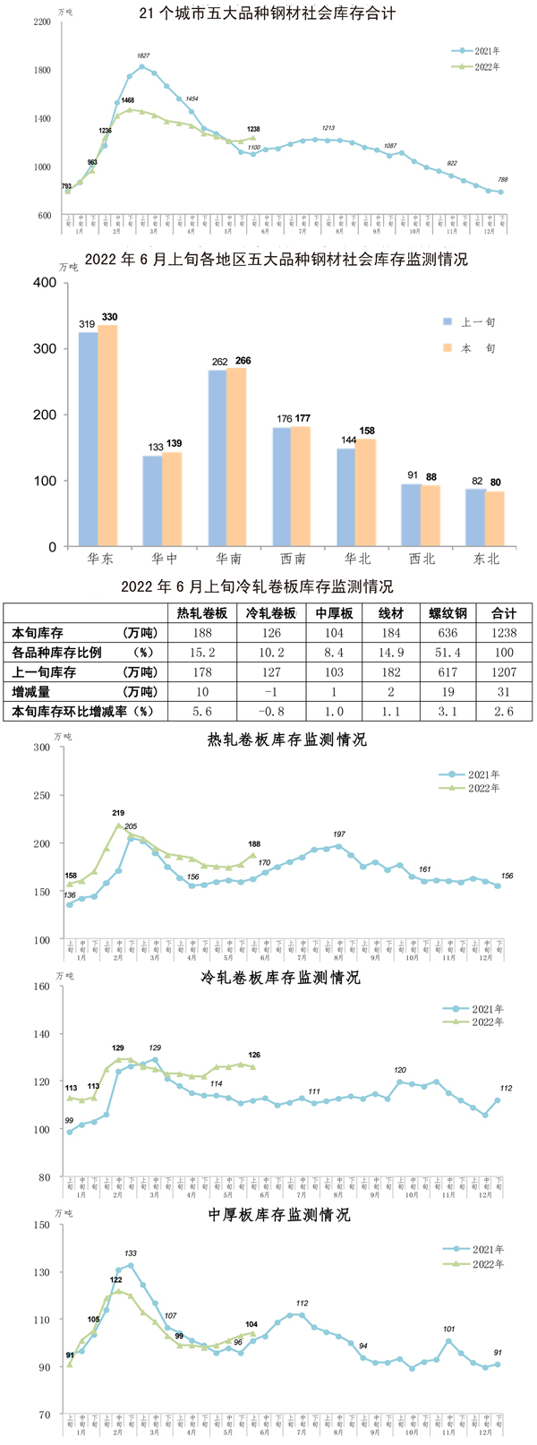 6月上旬,21個城市五大品種鋼材社會庫存為1238萬噸,環比增加31萬噸,上升2.6%,庫存連續9旬下降后首次回升;比今年初增加450萬噸,上升57.1%;同比增加138萬噸,上升12.5%。