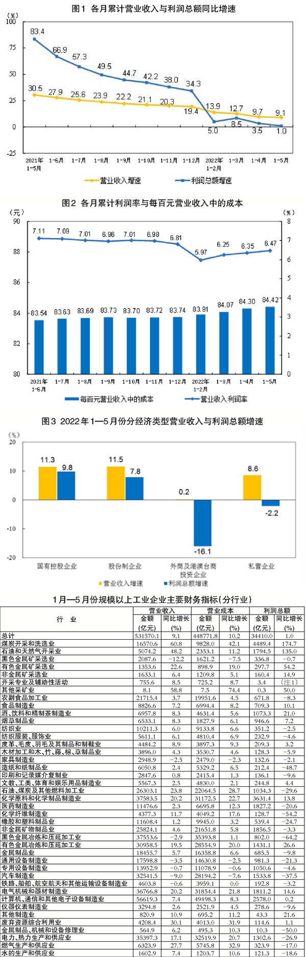 1月—5月份,采礦業(yè)實現(xiàn)利潤總額7082.7億元,同比增長1.31倍;制造業(yè)實現(xiàn)利潤總額25579.5億元,下降10.8%;電力、熱力、燃氣及水生產(chǎn)和供應業(yè)實現(xiàn)利潤總額1747.9億元,下降24.7%。在41個工業(yè)大類行業(yè)中,16個行業(yè)利潤總額同比增長,24個行業(yè)下降,1個行業(yè)由虧轉(zhuǎn)盈。主要行業(yè)利潤情況如下:煤炭開采和洗選業(yè)利潤總額同比增長1.75倍,石油和天然氣開采業(yè)增長1.35倍,有色金屬冶煉和壓延加工業(yè)增長26.6%,電氣機械和器材制造業(yè)增長14.6%,化學原料和化學制品制造業(yè)增長13.8%,計算機、通信和其他電子設備制造業(yè)增長0.2%,紡織業(yè)下降2.5%,非金屬礦物制品業(yè)下降3.3%,專用設備制造業(yè)下降4.6%,農(nóng)副食品加工業(yè)下降8.3%,通用設備制造業(yè)下降21.3%,電力、熱力生產(chǎn)和供應業(yè)下降26.9%,石油、煤炭及其他燃料加工業(yè)下降29.6%,汽車制造業(yè)下降37.5%,黑色金屬冶煉和壓延加工業(yè)下降64.2%。