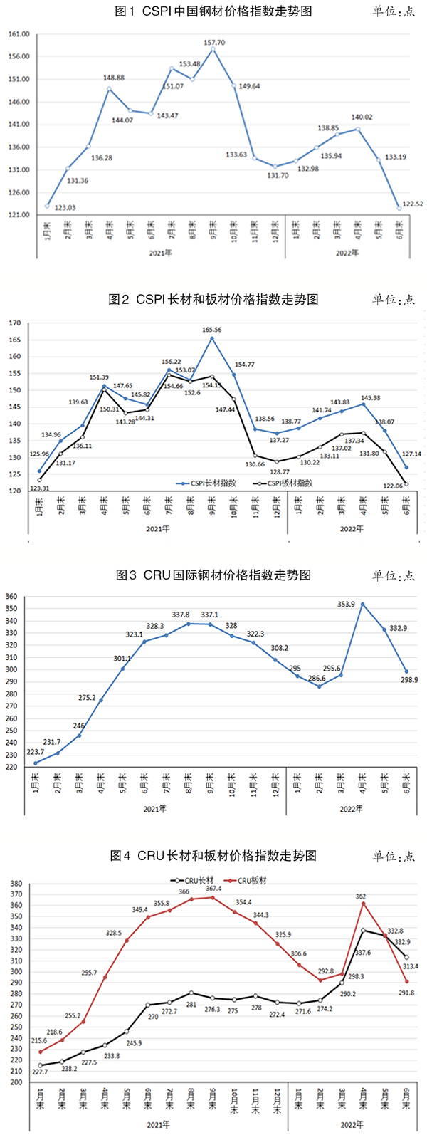 據中國鋼鐵工業協會監測,6月末,中國鋼材價格指數(CSPI)為122.52點,下降10.67點,降幅為8.01%,較5月份擴大3.13個百分點,連續2個月環比下降;同比下降20.96點,降幅為14.61%,連續3個月同比下降(見圖1)。