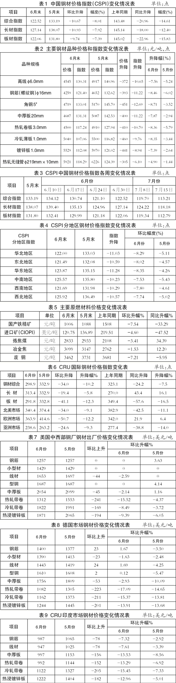 6月份,國家穩增長政策措施陸續出臺并相繼落地,但鋼材需求形勢仍不及預期,鋼鐵產量環比減少,原燃料價格有所回落,鋼材價格也有所下降。進入7月份以來,鋼材價格繼續呈小幅下降走勢。
