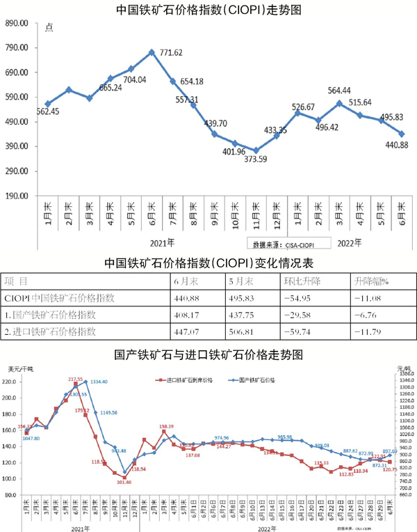 據鋼協監測,6月末,中國鐵礦石價格指數(CIOPI)為440.88點,環比下降54.95點,降幅為11.08%;降幅較5月份擴大7.24個百分點。
