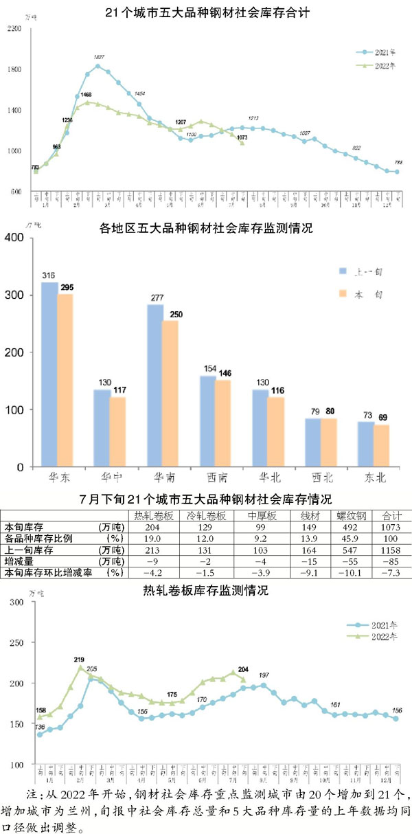 7月下旬,21個城市五大品種鋼材社會庫存為1073萬噸,環(huán)比減少85萬噸,下降7.3%,庫存降幅擴大;比6月下旬減少179萬噸,下降14.3%;比今年初增加285萬噸,上升36.2%;比去年同期減少149萬噸,下降12.2%。