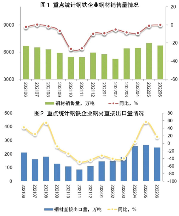 據營銷月報統計,2022年6月份,重點統計鋼鐵企業銷售鋼材6728.72萬噸,比去年同期上升0.25%;鋼材日銷水平為224.29萬噸,日銷環比下降0.97%。其中,國內銷售鋼材6481.17萬噸,比去年同期下降0.31%;直接出口鋼材247.55萬噸,環比下降6.73%,比去年同期上升17.43%。6月份,鋼材產銷率為99.42%,環比下降0.60個百分點,同比上升0.67個百分點。