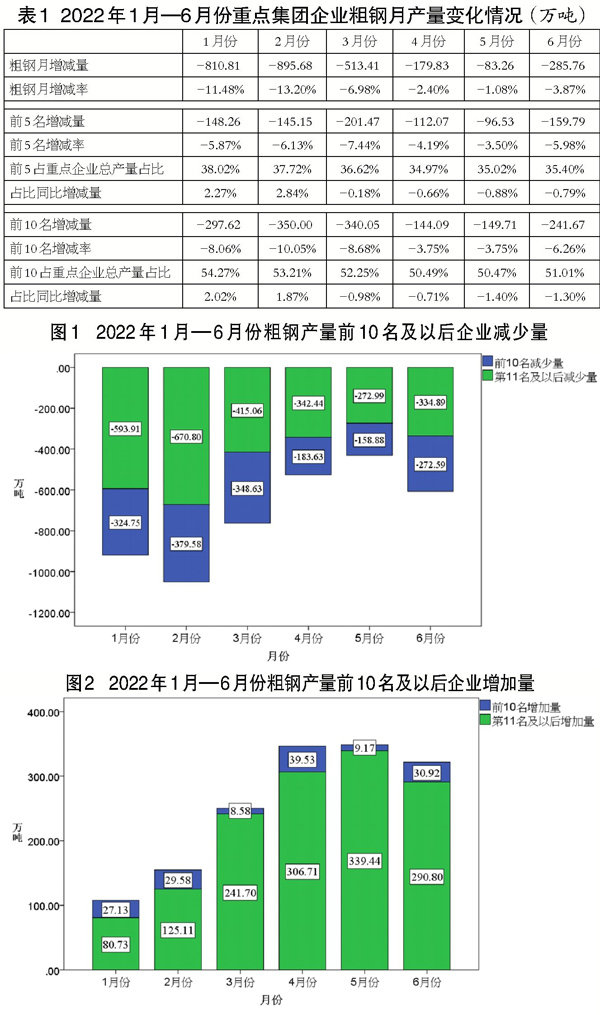 1月—6月份,重點鋼鐵企業粗鋼月產量同比均減少,實現了上半年鋼鐵企業粗鋼產量同比下降的目標。其中,1月份、2月份產量第11名及以后的企業對產量下降的貢獻較大,3月份、4月份、6月份產量前10名企業對產量下降的貢獻較大,5月份第11名及以后的企業的產量同比在增加。