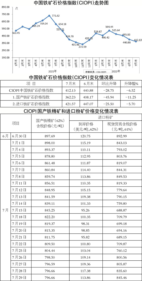 據(jù)鋼協(xié)監(jiān)測(cè),7月末,中國(guó)鐵礦石價(jià)格指數(shù)(CIOPI)為412.13點(diǎn),環(huán)比下降28.75點(diǎn),降幅為6.52%,較6月收窄4.56個(gè)百分點(diǎn);同比下降242.5點(diǎn),降幅為37.00%。