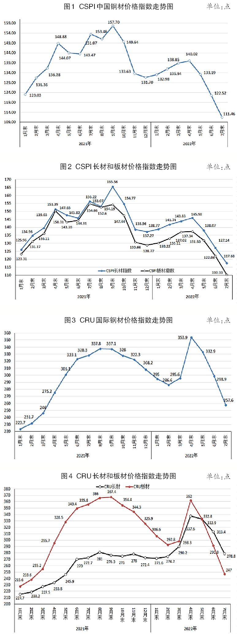 據中國鋼鐵工業協會監測,7月末,中國鋼材價格指數(CSPI)為111.46點,環比下降11.06點,降幅為9.03%,連續第3個月環比下降;同比下降42.02點,降幅為27.38%,連續第4個月同比下降。(見圖1)