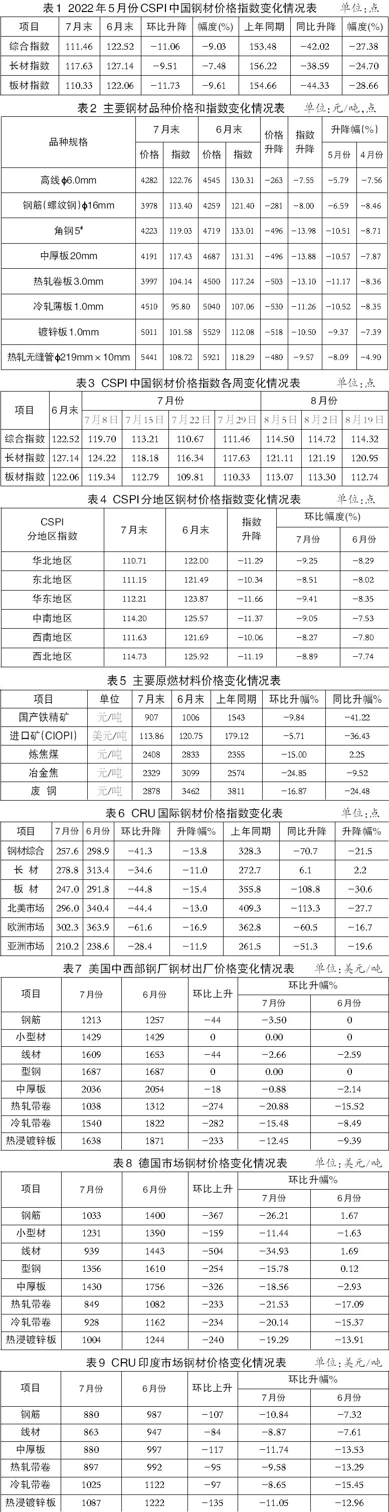 7月末,CSPI長材指數為117.63點,環比下降9.51點,降幅為7.48%;CSPI板材指數為110.33點,環比下降11.73點,降幅為9.61%,高于長材2.13個百分點。長材、板材指數分別同比下降38.59點和44.33點,降幅分別為24.70%和28.66%。(見圖2、表1)