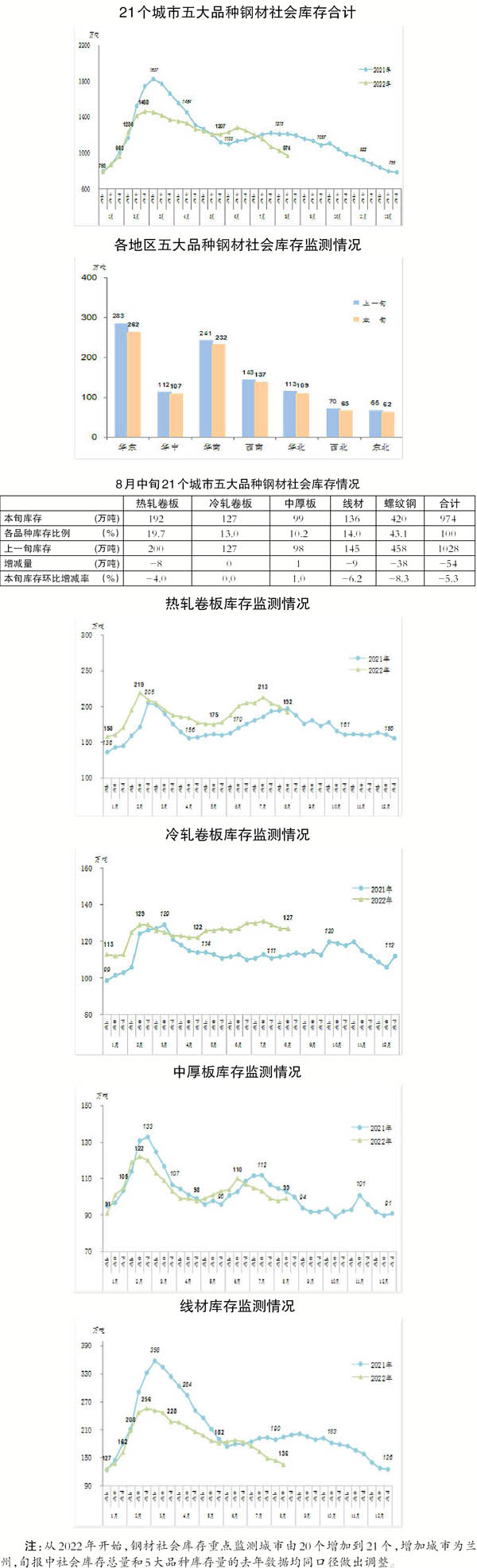 8月中旬,21個城市五大品種鋼材社會庫存為974萬噸,環(huán)比減少54萬噸,下降5.3%,庫存持續(xù)下降;比今年初增加186萬噸,上升23.6%;比去年同期減少241萬噸,下降19.9%。