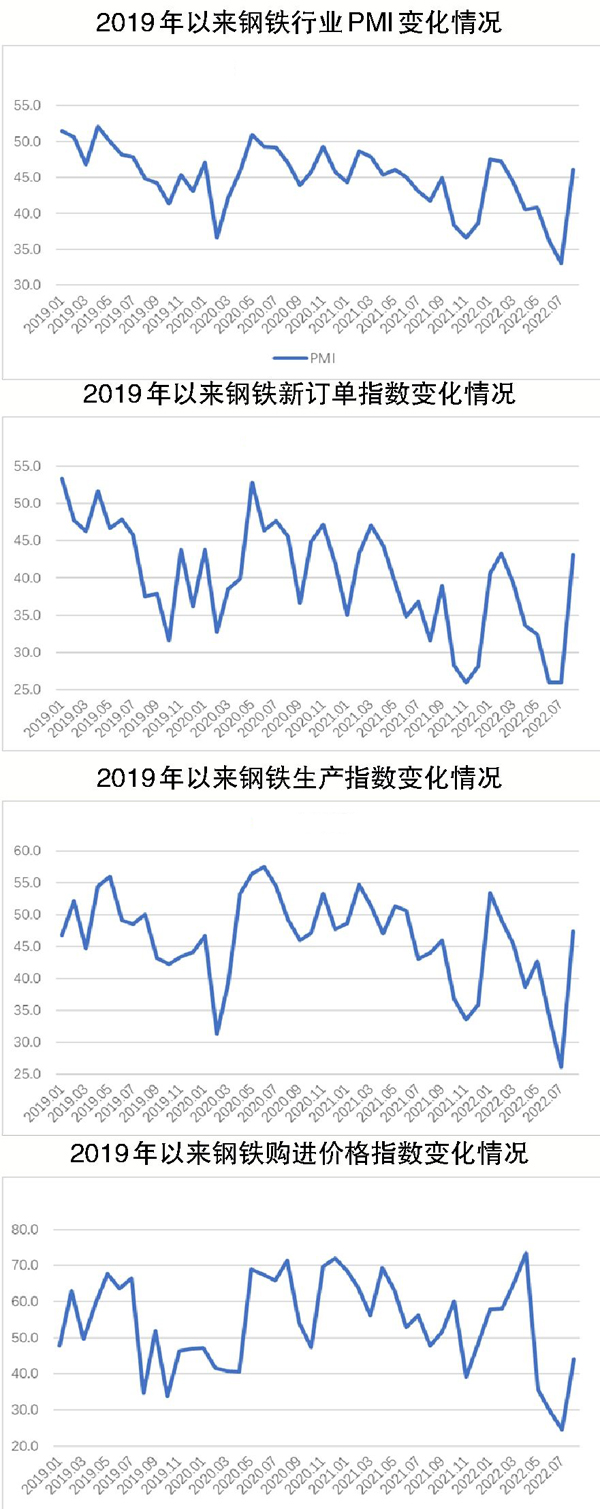 從中物聯鋼鐵物流專業委員會調查、發布的鋼鐵行業PMI來看,2022年8月份為46.1%,環比回升13.1個百分點,顯示鋼鐵市場連續收緊態勢有所放緩,行業運行有所恢復。從分項指數變化來看,市場需求下行趨勢有所放緩,鋼廠生產有所恢復,但供需兩端仍保持偏弱格局,鋼材價格小幅回升,原材料價格止跌反彈。預計9月份,鋼材需求繼續改善,但改善空間或將有限,鋼廠生產保持回升,鋼材價格或將小幅震蕩。