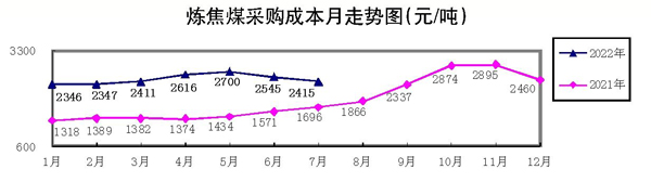 7月份,對標企業煉焦煤加權平均折算成干基的采購成本為2414.66元/噸,環比下降130.76元/噸,降幅為5.14%。1月—7月份,煉焦煤累計平均折算成干基的采購成本為2481.60元/噸,同比升高1029.76元/噸,升幅為70.93%。