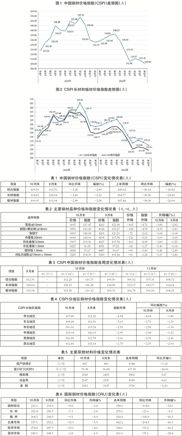 據鋼協監測,10月末,中國鋼材價格指數(CSPI)為109.50點,環比下降3.26點,降幅為2.89%,較9月份加大1.65個百分點;同比下降40.14點,降幅為26.82%。