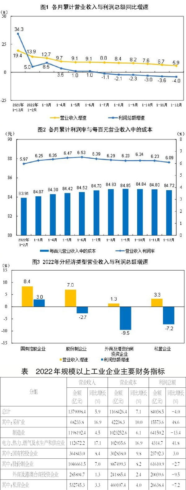 2022年,規模以上工業企業實現營業收入137.91萬億元,比2021年增長5.9%;發生營業成本116.84萬億元,增長7.1%;營業收入利潤率為6.09%,比2021年下降0.64個百分點。