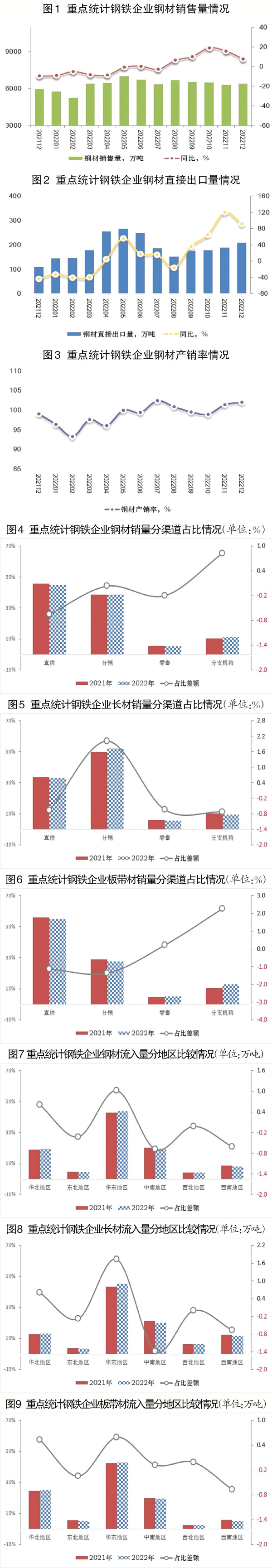 從中國鋼鐵工業協會重點統計鋼鐵企業鋼材營銷統計數據來看,2022年12月份,重點統計鋼鐵企業銷售鋼材6409.92 萬噸,比2021年同期上升7.59%;鋼材日銷水平為206.77萬噸,日銷環比下降1.66%。其中,國內銷售鋼材6201.42萬噸,比2021年同期上升6.03%;直接出口鋼材208.50萬噸,環比上升10.11%,比2021年同期上升91.06%。2022年12月份,鋼材產銷率為102.02%,環比上升0.60個百分點,同比上升2.96個百分點。