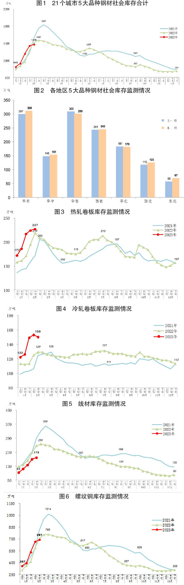 2月中旬,分地區(qū)來看,7大區(qū)域鋼材社會庫存環(huán)比各有升降,具體情況為:東北地區(qū)環(huán)比增加12萬噸,上升21.8%,為增量和增幅最大地區(qū);華東地區(qū)增加12萬噸,上升4.0%;西北地區(qū)增加8萬噸,上升7.0%;華中地區(qū)增加5萬噸,上升3.4%;西南地區(qū)增加2萬噸,上升0.8%;華南地區(qū)環(huán)比減少7萬噸,下降2.3%;華北地區(qū)減少2萬噸,下降1.1%。