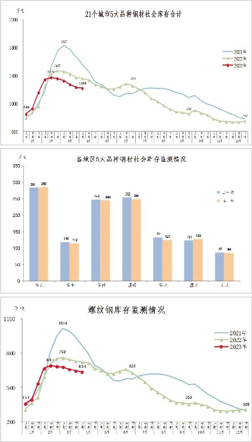 4月上旬,5大品種鋼材社會庫存環比各有升降,其中螺紋鋼為減量最大品種。熱軋卷板庫存為183萬噸,環比增加3萬噸,上升1.7%,庫存連續4旬下降后小幅回上升;比今年初增加26萬噸,上升16.6%;比去年同期減少3萬噸,下降1.6%。冷軋卷板庫存為131萬噸,環比減少1萬噸,下降0.8%,庫存變化不大;比今年初增加18萬噸,上升15.9%;比去年同期增加8萬噸,上升6.5%。中厚板庫存為101萬噸,環比持平;比今年初增加7萬噸,上升7.4%;比去年同期增加2萬噸,上升2.0%。線材庫存為169萬噸,環比減少5萬噸,下降2.9%,庫存連續小幅下降;比今年初增加89萬噸,上升111.3%;比去年同期減少57萬噸,下降25.2%。螺紋鋼庫存為634萬噸,環比減少10萬噸,下降1.6%,庫存降幅收窄;比今年初增加326萬噸,上升105.8%;比去年同期減少88萬噸,下降12.2%。