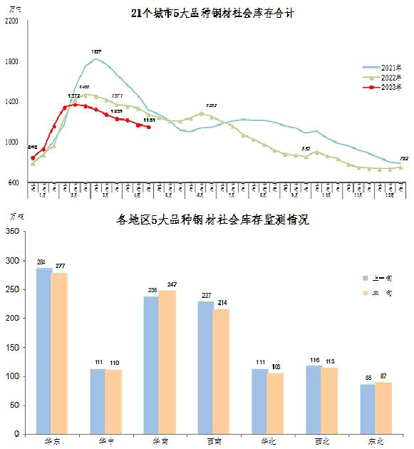 4月下旬,21個(gè)城市5大品種鋼材社會(huì)庫(kù)存為1151萬(wàn)噸,環(huán)比減少19萬(wàn)噸,下降1.6%,庫(kù)存小幅下降;比3月下旬減少80萬(wàn)噸,下降6.5%;比今年初增加399萬(wàn)噸,上升53.1%;比去年同期減少119萬(wàn)噸,下降9.4%。