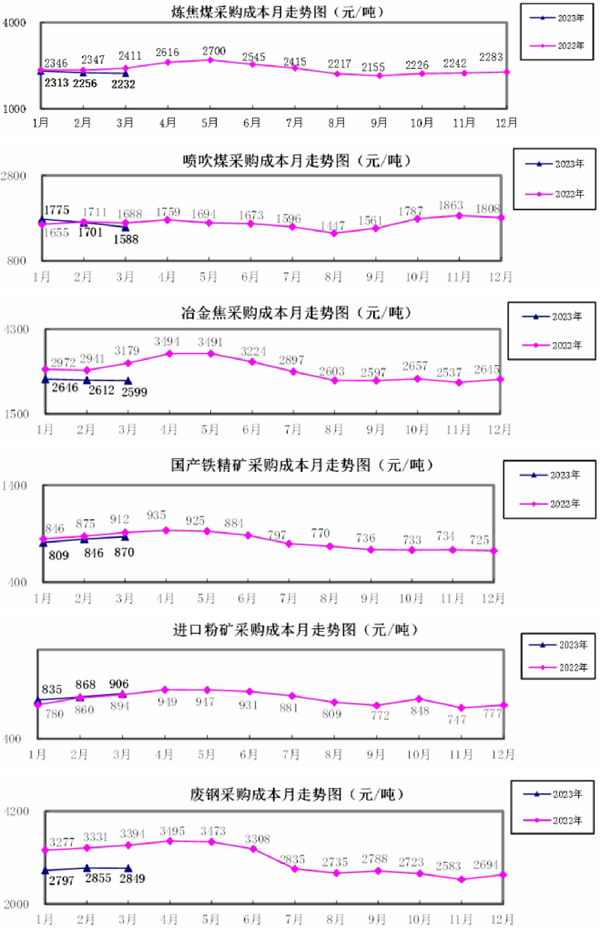 1月—3月份,煉焦煤采購成本同比下降4.51%;冶金焦同比下降13.68%;國產鐵精礦同比下降3.86%,進口粉礦同比上升3.25%;廢鋼同比下降15.33%。