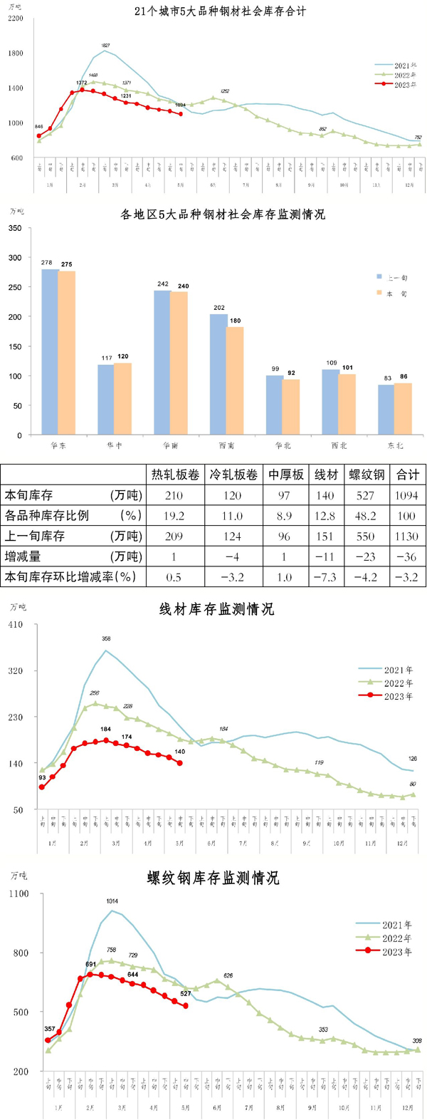 5月中旬,21個城市5大品種鋼材社會庫存為1094萬噸,環比減少36萬噸,下降3.2%,庫存繼續下降;比今年初增加342萬噸,上升45.5%;比去年同期減少114萬噸,下降9.4%。