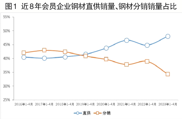 對近8年(2016年—2023年4月份)會員企業(yè)鋼材直供銷量占比、鋼材分銷銷量占比進(jìn)行比較可知,2019年鋼材直供銷量占比為41.47%,高出鋼材分銷銷量占比0.62個百分點(diǎn),這是自2016年以來會員企業(yè)鋼材直供銷量占比首次高于鋼材分銷銷量占比。2022年1月—4月份,會員企業(yè)鋼材直供銷量占比提升至44.81%,高出鋼材分銷銷量占比5.87個百分點(diǎn)。2023年1月—4月份,會員企業(yè)鋼材直供銷量占比進(jìn)一步提升至48.01%,高出鋼材分銷銷量占比13.71個百分點(diǎn)。這表明2023年1月—4月份會員企業(yè)直供渠道優(yōu)勢較2022年1月—4月份有了進(jìn)一步擴(kuò)大。