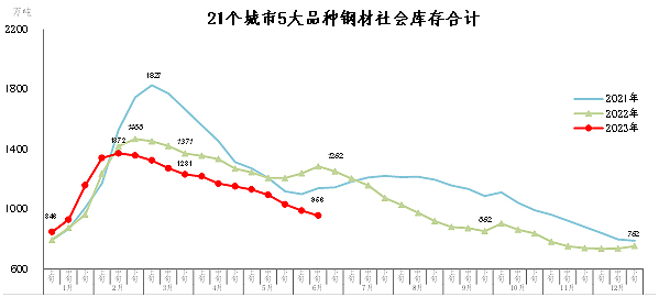 6月中旬,21個(gè)城市5大品種鋼材社會(huì)庫(kù)存為956萬(wàn)噸,環(huán)比減少33萬(wàn)噸,下降3.3%,庫(kù)存繼續(xù)下降;比今年初增加204萬(wàn)噸,上升27.1%;比去年同期減少329萬(wàn)噸,下降25.6%。