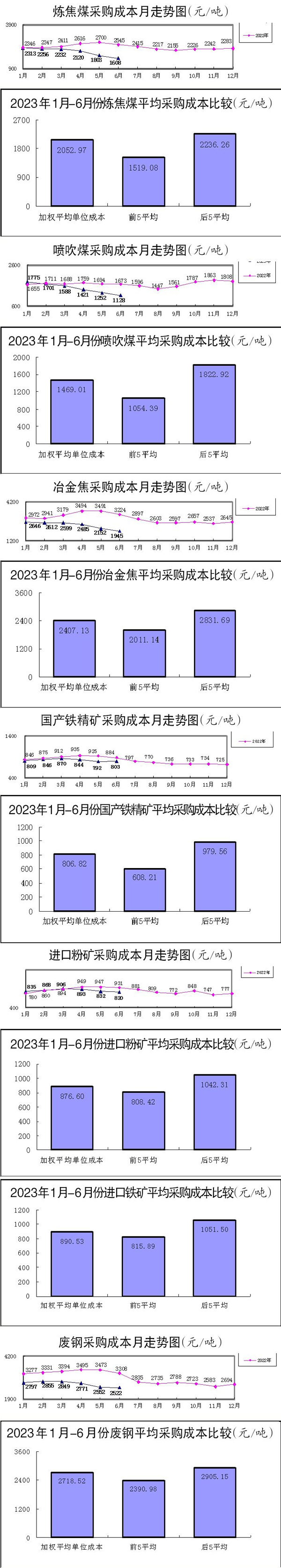 1月—6月份,煉焦煤采購成本同比下降17.66%;冶金焦同比下降25.07%;國產鐵精礦同比下降7.15%,進口粉礦同比下降3.84%;廢鋼同比下降19.65%。