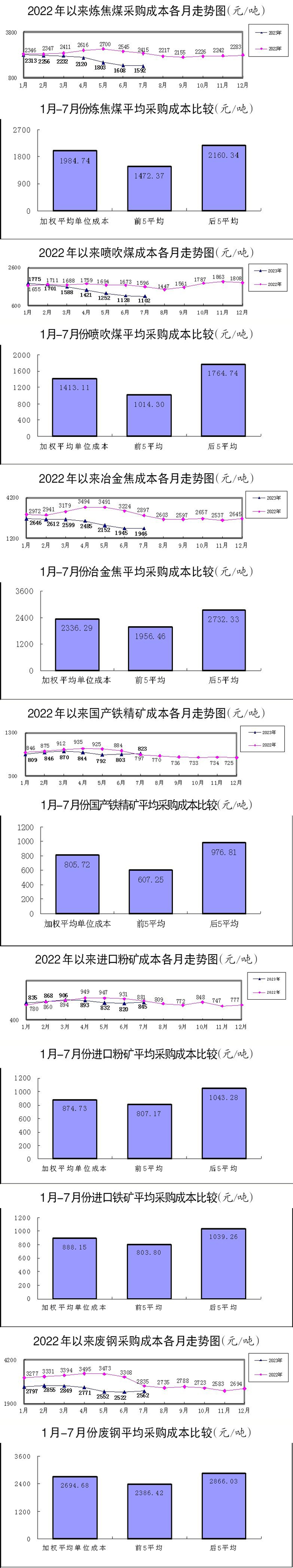 1月—7月份,煉焦煤采購成本同比下降20.02%;冶金焦同比下降26.17%;國產(chǎn)鐵精礦同比下降5.97%,進口粉礦同比下降3.70%;廢鋼同比下降19.07%。