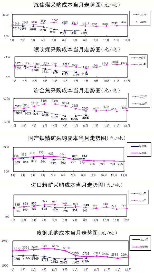 1月—8月份,煉焦煤采購成本同比下降20.31%;冶金焦同比下降25.79%;國產鐵精礦同比下降5.09%,進口粉礦同比下降2.42%;廢鋼同比下降18.19%。
