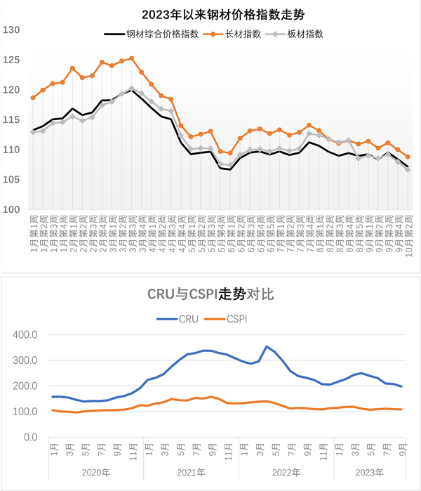 10月13日當(dāng)周,中國鋼材價格指數(shù)(CSPI)為107.16點(diǎn),周環(huán)比下降1.24點(diǎn),降幅為1.15%;比9月末下降1.24點(diǎn),降幅為1.14%;比去年底下降6.09點(diǎn),降幅為5.38%;同比下降5.07點(diǎn),降幅為4.52%。其中,長材價格指數(shù)為108.81點(diǎn),周環(huán)比下降1.19點(diǎn),降幅為1.08%;比9月末下降1.19點(diǎn),降幅為1.08%;同比下降9.34點(diǎn),降幅為7.91%。板材價格指數(shù)為106.64點(diǎn),周環(huán)比下降1.31點(diǎn),降幅為1.21%;比9月末下降1.31點(diǎn),降幅為1.21%;同比下降4.71點(diǎn),降幅為4.23%。(如圖所示)