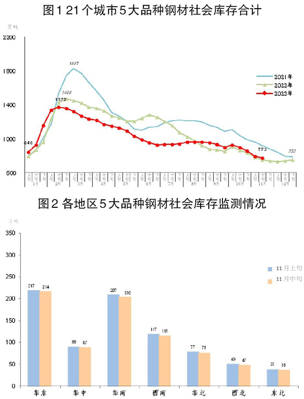 11月中旬,21個城市5大品種鋼材社會庫存為773萬噸,環(huán)比減少19萬噸,下降2.4%,庫存延續(xù)下降態(tài)勢,降幅有所收窄;比今年初增加21萬噸,上升2.8%;比去年同期增加22萬噸,上升2.9%。