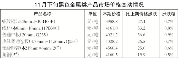 本報訊 據國家統計局對全國流通領域9大類50種重要生產資料市場價格的監測顯示,11月下旬與11月中旬相比,17種產品價格環比上漲,30種下降,3種持平。其中,黑色金屬類6種生產資料市場價格環比均上漲。