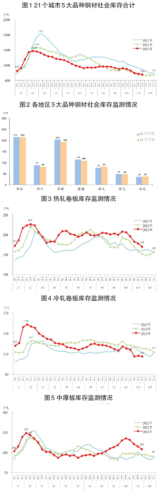11月下旬,5大品種鋼材社會庫存環比全部下降。其中,熱軋卷板為減量和降幅最大品種。熱軋卷板社會庫存為170萬噸,環比減少8萬噸,下降4.5%,庫存降幅擴大;比10月下旬減少26萬噸,下降13.3%;比今年初增加13萬噸,上升8.3%;比去年同期增加18萬噸,上升11.8%。冷軋卷板社會庫存為106萬噸,環比減少1萬噸,下降0.9%,庫存小幅波動;比10月下旬減少10萬噸,下降8.6%;比今年初減少7萬噸,下降6.2%;比去年同期減少12萬噸,下降10.2%。中厚板社會庫存為105萬噸,環比減少4萬噸,下降3.7%,庫存連續下降;比10月下旬減少14萬噸,下降11.8%;比今年初增加11萬噸,上升11.7%;比去年同期增加8萬噸,上升8.2%。線材社會庫存為81萬噸,環比減少3萬噸,下降3.6%;比10月下旬減少9萬噸,下降10.0%;比今年初增加1萬噸,上升1.3%;比去年同期增加3萬噸,上升3.8%。螺紋鋼社會庫存為293萬噸,環比減少2萬噸,下降0.7%,庫存降幅收窄;比10月下旬減少43萬噸,下降12.8%;比今年初減少15萬噸,下降4.9%;比去年同期減少1萬噸,下降0.3%。