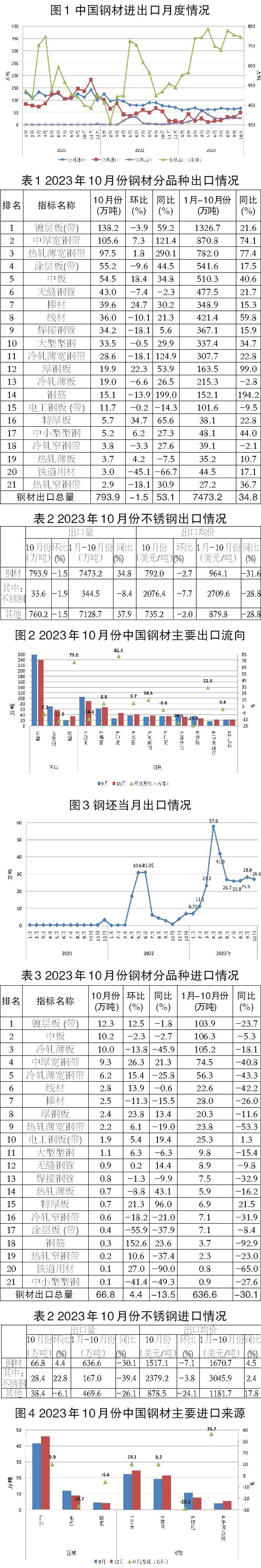 1月—10月份,我國進口鋼材636.6萬噸,同比減少30.1%;進口平均單價為1670.7美元/噸,同比上漲4.5%;進口鋼坯247.6萬噸,同比減少67.6%。1月—10月份,我國出口鋼材7473.2萬噸,同比增長34.8%;出口平均單價為964.1美元/噸,同比下跌31.6%;出口鋼坯274.1萬噸,同比增加181.8萬噸;粗鋼凈出口7191.7萬噸,同比增加2817.6萬噸,增幅為64.4%。