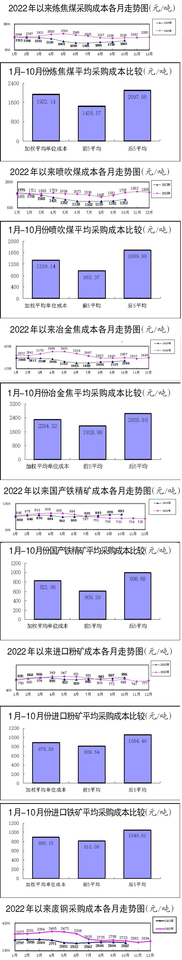 10月份,除生鐵、廢鋼采購成本環比下降外,其他品種全面上升,煤焦類品種升幅較大。
