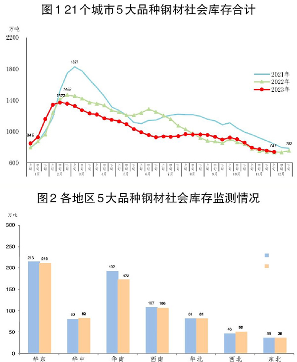 12月上旬,21個(gè)城市5大品種鋼材社會(huì)庫存為737萬噸,環(huán)比減少18萬噸,下降2.4%,庫存延續(xù)小幅下降走勢(shì);比今年初減少15萬噸,下降2.0%;比去年同期增加2萬噸,上升0.3%。