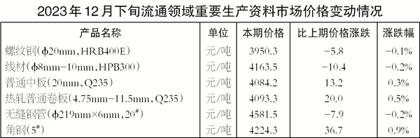 2023年12月下旬,φ20毫米HRB400E螺紋鋼的價(jià)格為3950.3元/噸,環(huán)比下跌5.8%,跌幅為0.1%;φ8毫米~φ10毫米HPB300線材價(jià)格為4163.5元/噸,環(huán)比下跌10.4%,跌幅為0.2%;20毫米Q235普通中板價(jià)格為4084.2元/噸,環(huán)比上漲13.2%,漲幅為0.3%;4.75毫米~11.5毫米Q235熱軋普通卷板的價(jià)格為4093.3元/噸,環(huán)比上漲20.0元/噸,漲幅為0.5%;φ219毫米×6毫米20#無(wú)縫鋼管的價(jià)格為4581.5元/噸,環(huán)比下跌7.9%,降幅為0.2%;5#角鋼的價(jià)格為4224.3元/噸,環(huán)比上漲36.7%,漲幅為0.9%。 (郭同炬)