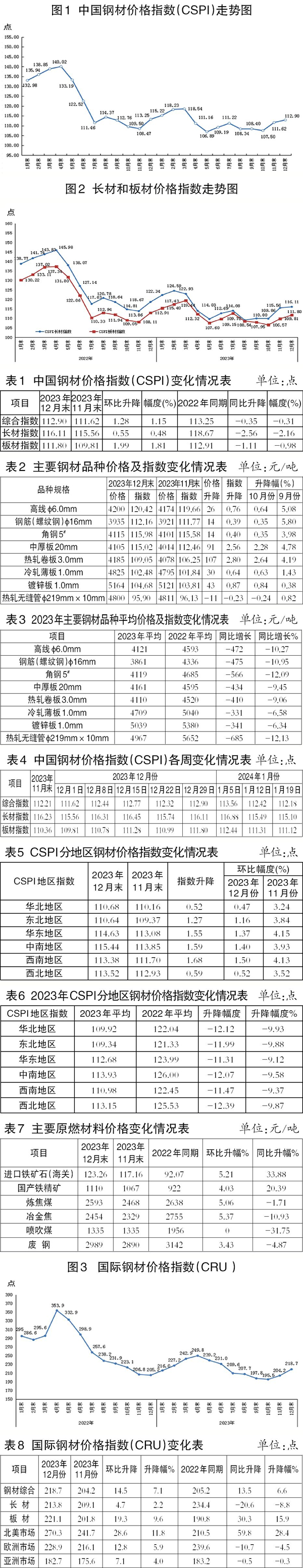 從全年情況看,2023年CSPI國內鋼材價格指數平均值為111.60點,同比下降11.07點,降幅為9.02%。從分月情況看,2023年1月—3月份價格指數小幅上升,4月—5月份由升轉降,6月—10月份呈窄幅波動,11月份明顯上漲,12月份升幅收窄。