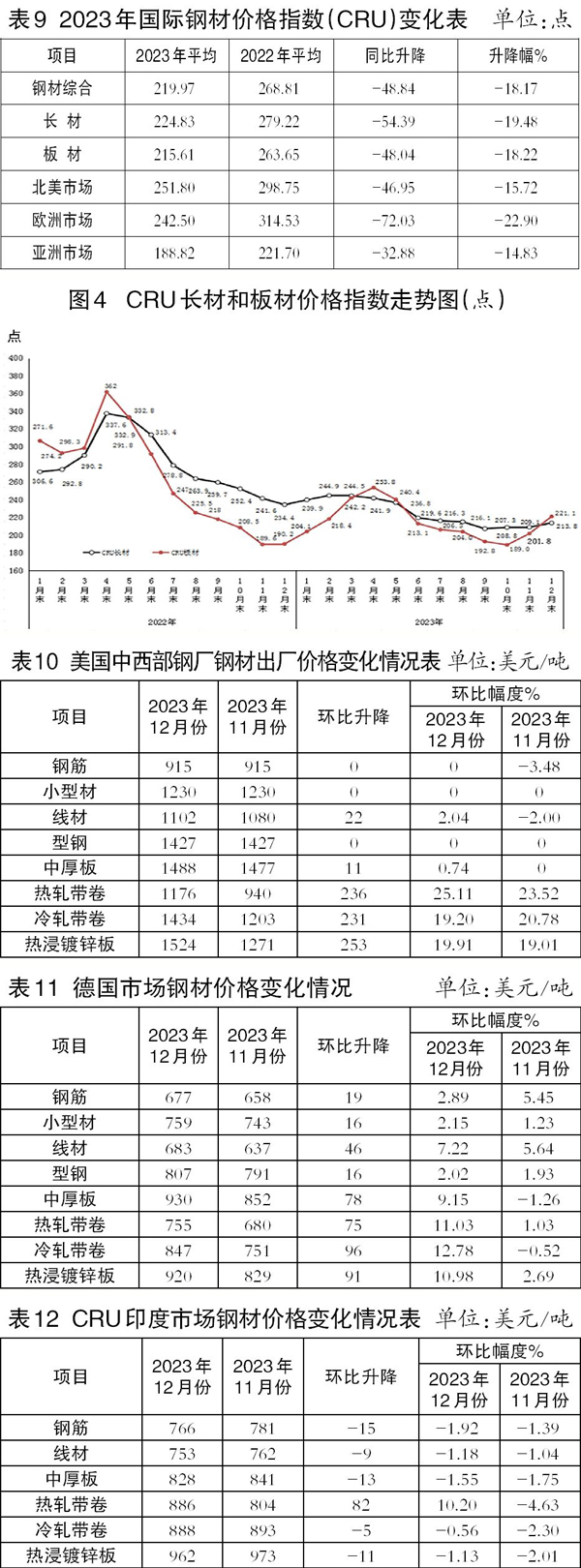 從全年情況看,2023年CRU長材指數平均為224.83點,同比下降54.4點,降幅為19.5%;CRU板材指數平均為215.6點,同比下降48.0點,降幅為18.2%。