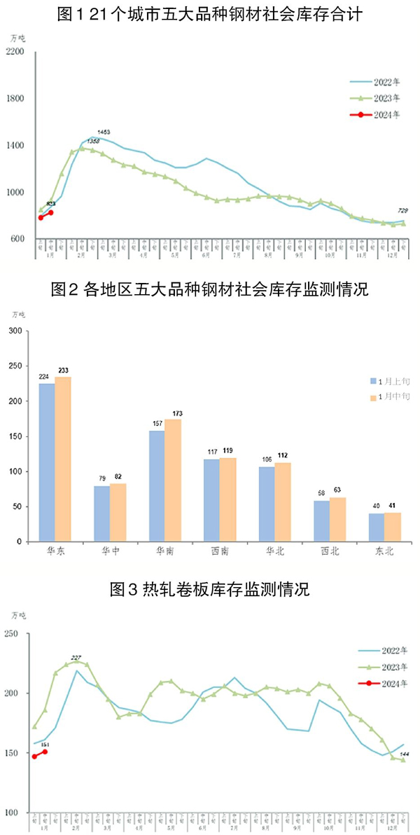 1月中旬,五大品種鋼材社會庫存環比均有所上升,其中螺紋鋼為增量最大品種,線材為增幅最大品種。熱軋卷板庫存為151萬噸,環比增加4萬噸,上升2.7%,庫存繼續上升,升幅略有擴大;比今年初增加7萬噸,上升4.9%;比去年同期減少35萬噸,下降18.8%。冷軋卷板庫存為110萬噸,環比增加4萬噸,上升3.8%,庫存繼續上升,升幅擴大;比今年初增加7萬噸,上升6.8%;比去年同期減少16萬噸,下降12.7%。中厚板庫存為105萬噸,環比增加4萬噸,上升4.0%;比今年初增加7萬噸,上升6.8%;比去年同期減少16萬噸,下降12.7%。線材庫存為99萬噸,環比增加7萬噸,上升7.6%,庫存持續上升;比今年初增加11萬噸,上升11.7%;比去年同期減少4萬噸,下降3.7%。螺紋鋼庫存為358萬噸,環比增加23萬噸,上升6.9%,庫存繼續上升,升幅有所擴大;比今年初增加53萬噸,上升17.4%;比去年同期減少36萬噸,下降9.1%。